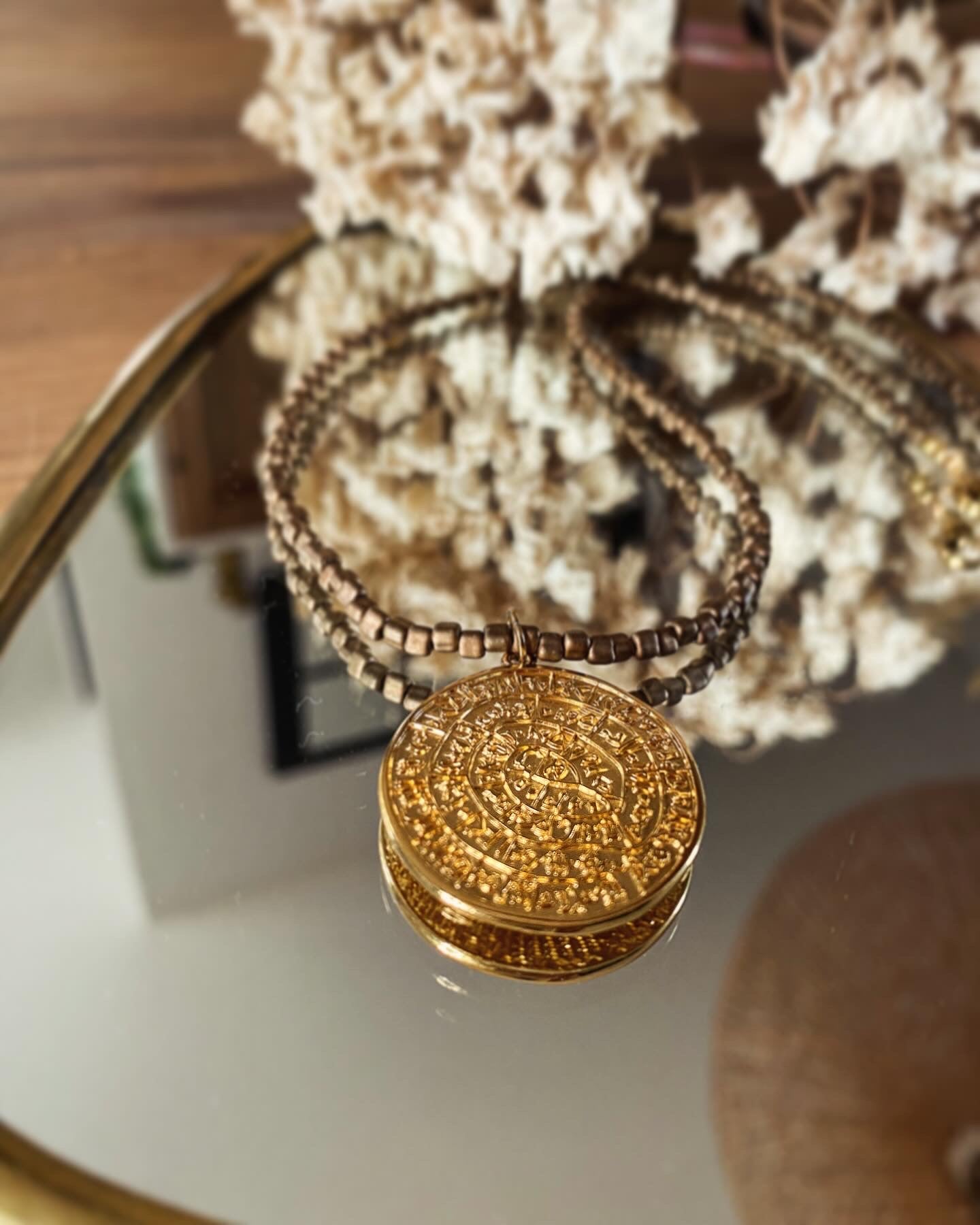 Médaillon gravé façon alphabet égyptien + perles bronze = l’équilibre parfait entre vibes sacrées et style moderne.