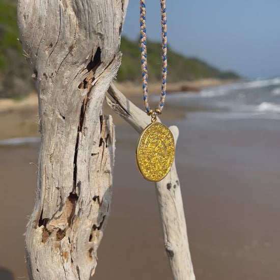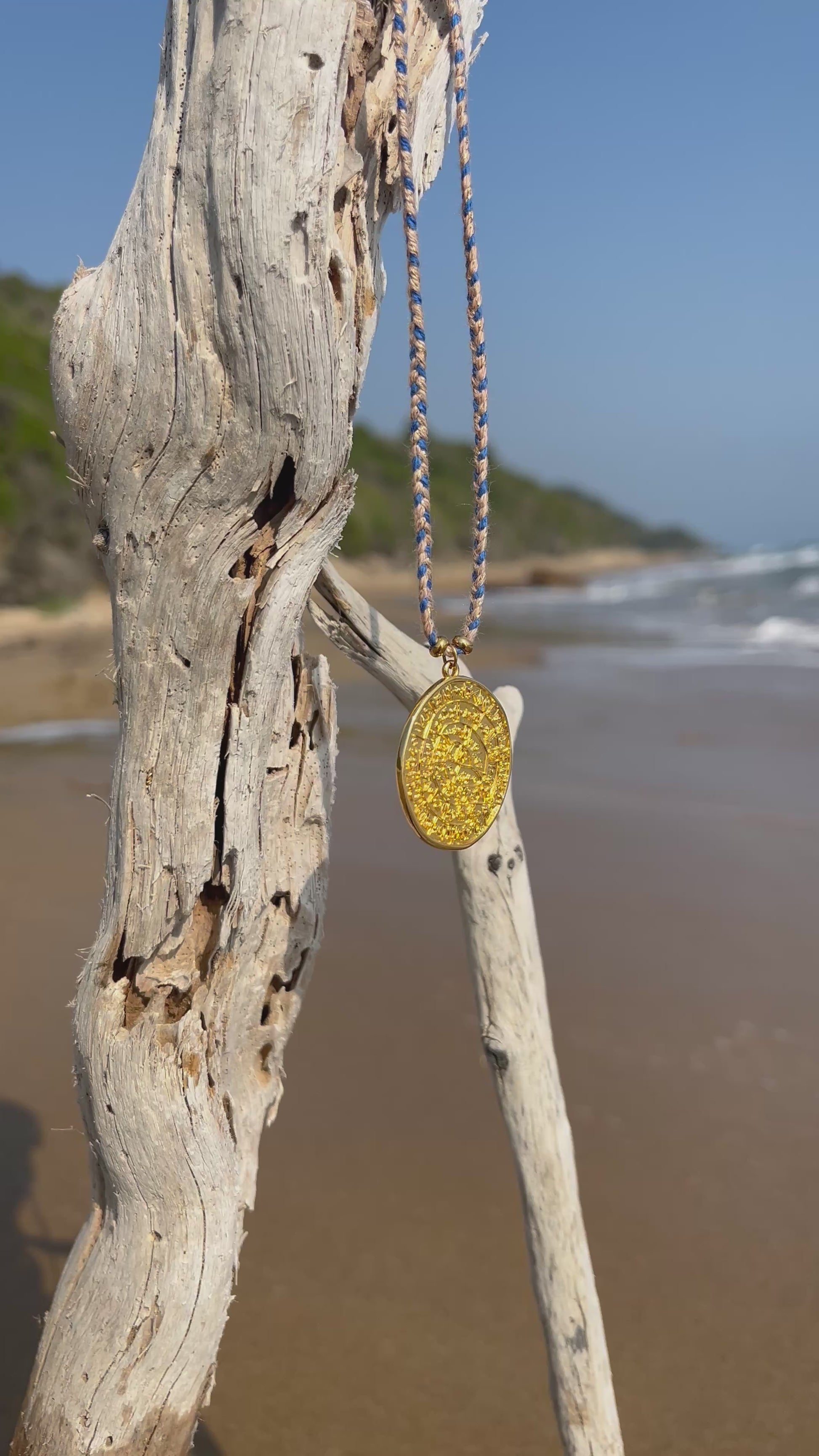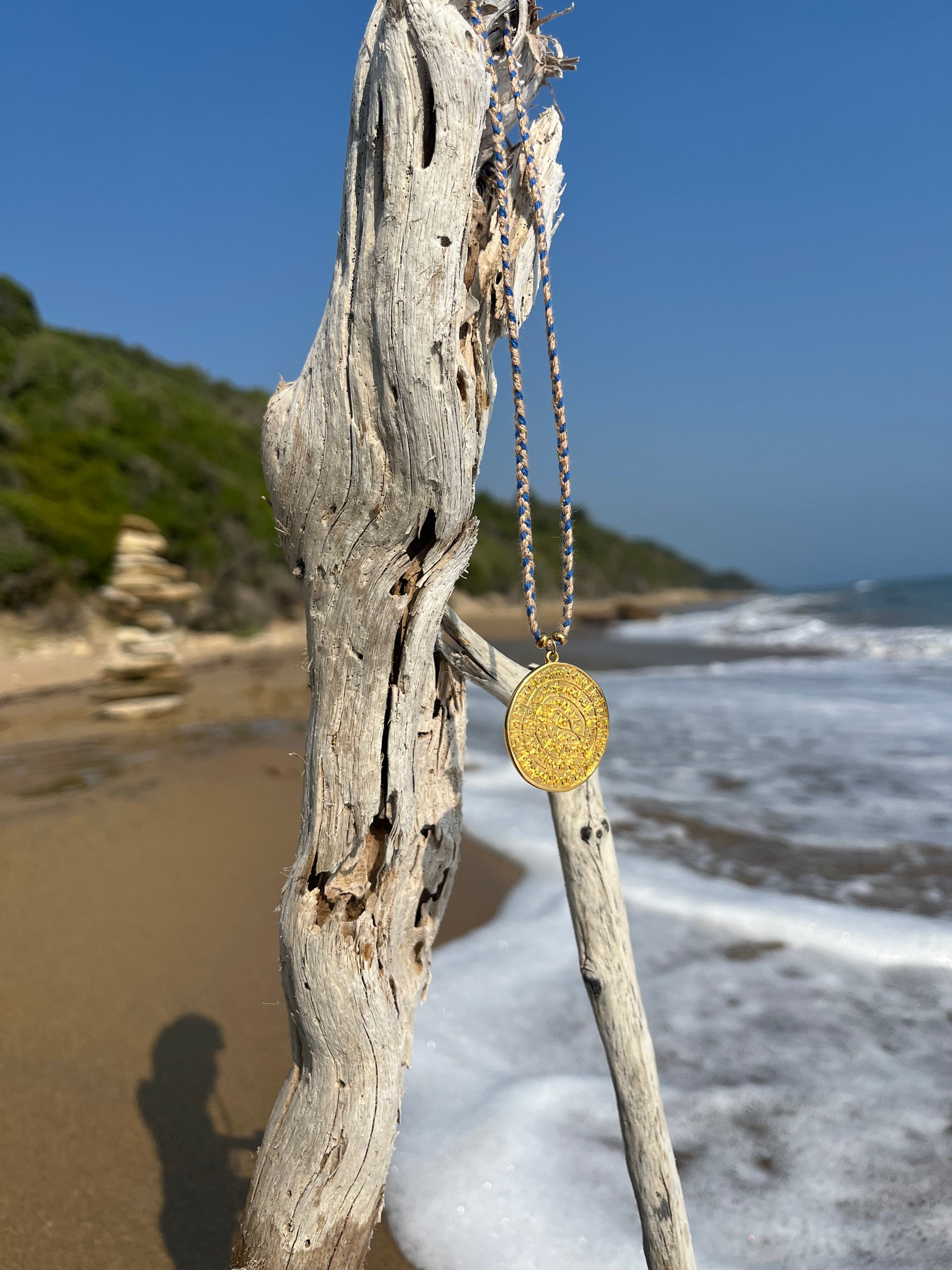 Nout est une médaille avec l’alphabet égyptien. Le médaillon est en acier inoxydable 316L et le cordon en coton.