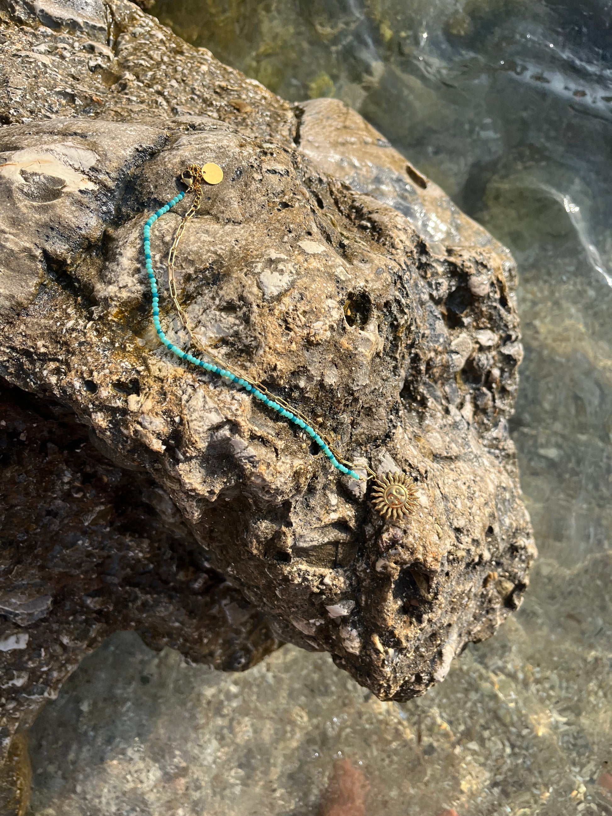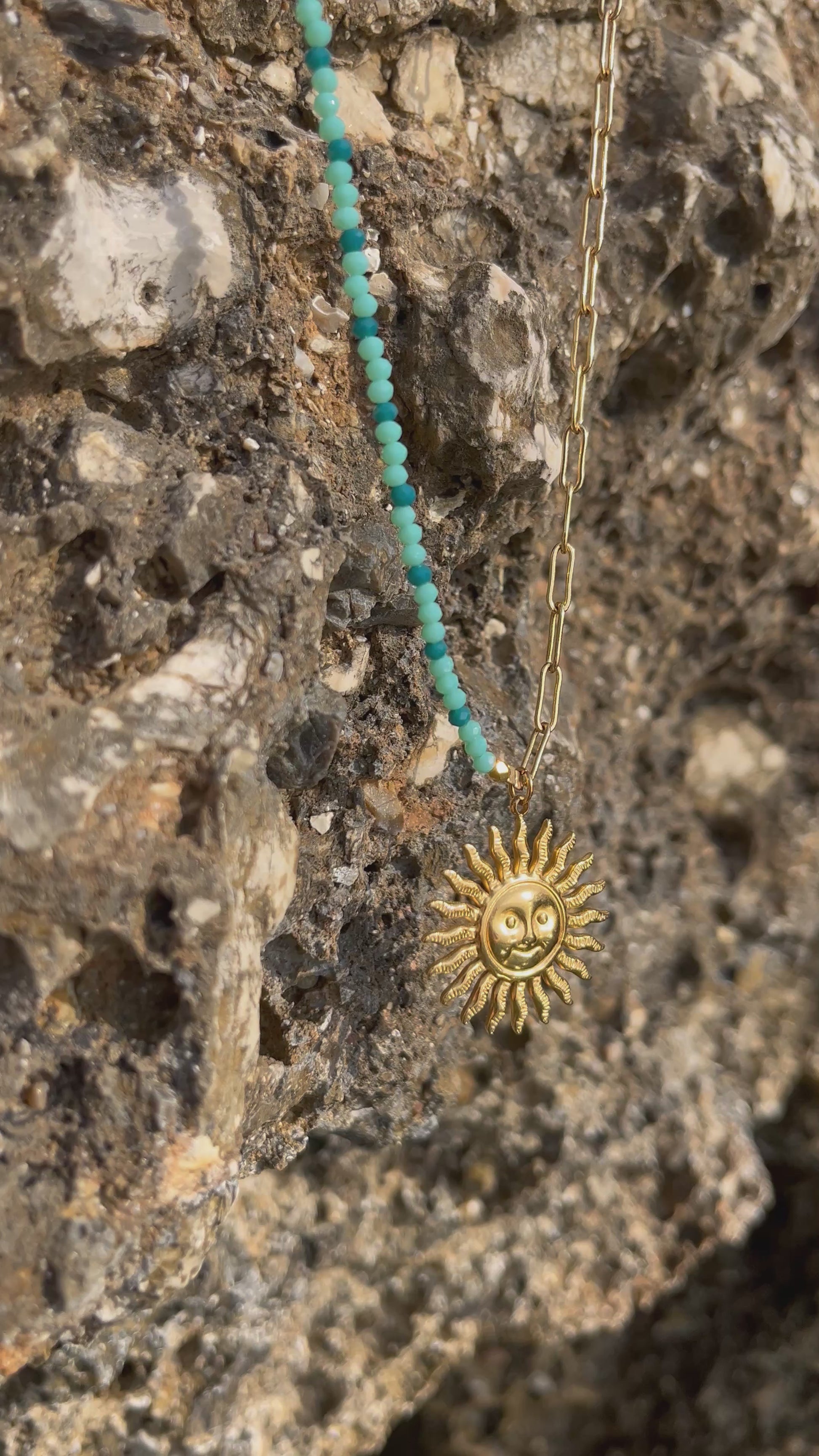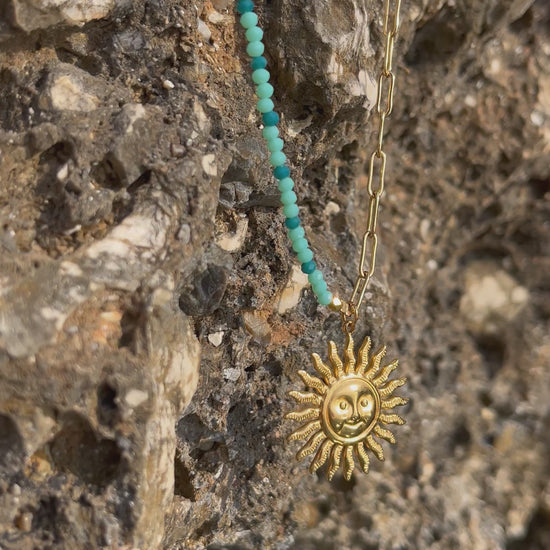Sublimez vous avec ce sautoir lumineux en acier inoxydable 316L, orné de perles de verre bleues et d’un grand pendentif soleil. Résistant à l’eau, hypoallergénique et intemporel, il allie élégance et symbolique solaire pour rayonner au quotidien.