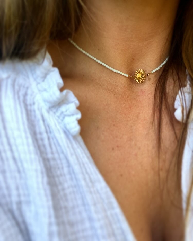 Perles pierre d’opale blanches et vertes + un soleil doré en acier inoxydable = vibes cosmiques pour une belle nuit d’été 🌞